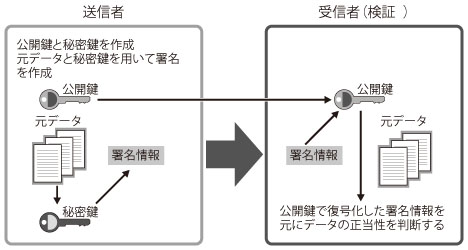 電子署名とは、電子文書に署名を付与することで、そのデータの発行元を明示し、正当性を証明するものです。公開鍵暗号方式を応用することで、データの作成者、およびそのデータが改ざんされていないことを証明します。