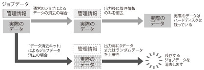 本体は、コピーや送受信、プリント出力時にジョブデータを管理情報領域と実データ領域に分けて保存します。管理情報はジョブ終了後、自動消去されますが、実データはハードディスク内に残った状態になります。