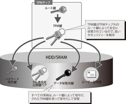 この機能を使用することで、ハードディスク内、およびSRAM内で管理しているパスワード情報や証明書情報を暗号化できます。