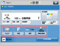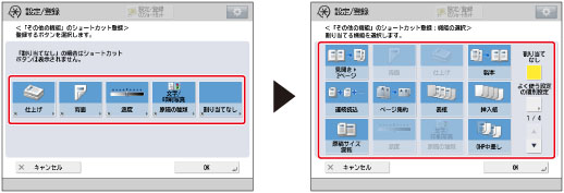 コピー画面に表示するショートカットを登録します。コピー画面では、[その他の機能]と[よく使う設定]から任意のボタンを5個まで登録できます。