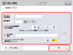 (テンキー)から、ボックスの番号を入力して指定する場合は、2桁のボックス番号を入力したあと、[OK]を押します。
