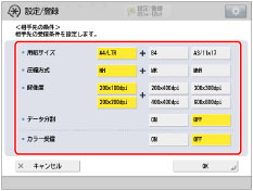 カラー受信に対応していない場合は[OFF]を押し、用紙サイズ、圧縮方法、解像度を設定します。