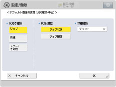 デフォルト画面の変更(状況確認/中止)を[ジョブ]、[ジョブ状況]、[プリント]に設定している場合