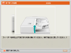フィーダーで紙づまりが発生したときは、続けて操作を行うことはできません。画面の指示に従って用紙を取り除いてください。(→マルチカラーイメージリーダーユニット・H1の紙づまり処理(オプション))