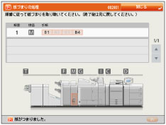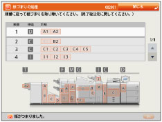 ホチキスを設定してプリント中に、紙づまりが起こって出力が停止した場合は、タッチパネルディスプレーに紙づまり箇所として表示された場所以外の用紙は取り除かないようにしてください。例えば本体で紙づまりが起きたときは、紙づまりの起きていないフィニッシャーからは用紙を取り除かないようにしてください。(本体の紙づまりを処理すると、フィニッシャー内の用紙はそのまま継続してホチキスされて、出力されます。)