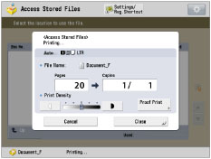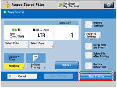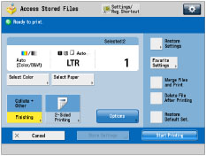 If you want to print a file stored in the machine from a computer or using [Store in Mail Box] of the Copy function with the settings that were set when the file was stored, do not print the file from the Change Print Settings screen. If you print the file from the Change Print Settings screen, the file may not be printed with the same settings that were set when the file was stored.