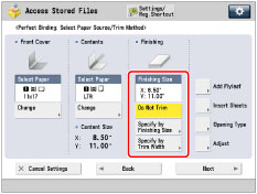 Not Trimmed: Length of the finishing size exceeds the width of the stacker (about 11 3/4" (297 mm)), or the depth of the finishing size exceeds the height of the stacker (about 8 3/4" (221 mm)).