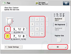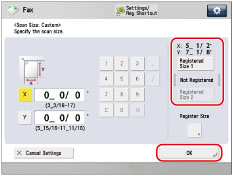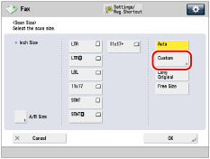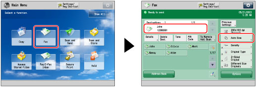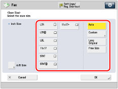 (Main Menu) → [Fax] → specify the desired destinations → press the scan size button.