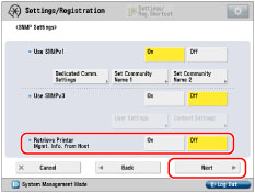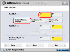 Press [On] for <Use SNMPv1> → [Dedicated Comm. Settings]. Press [On] for <Dedicated Community> → [Read/Write] for <MIB Access Permission>.