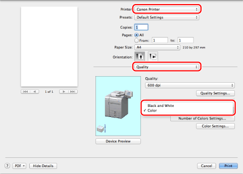 Select your printer → [Quality] → [Black and White] or [Color] from [Color Mode].