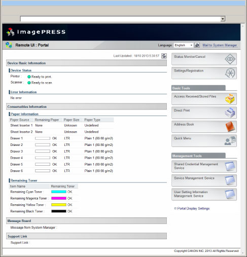 The Remote UI enables you to access the machine via a network to display the current status and settings for the machine, and the status of all information and job processing. You can manage the machine from a computer connected to the network without having to perform operations on the machine itself. When you enter the machine's IP address into your web browser, the Remote UI's top page or main screen is displayed on your computer screen, as shown below: