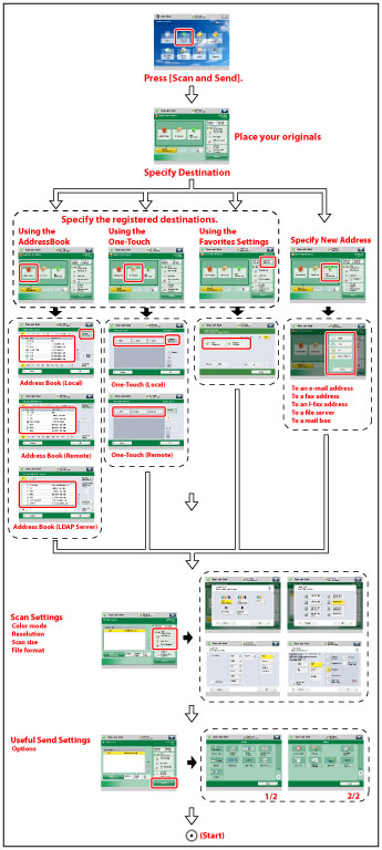 If you press [Scan and Send] on the Main Menu screen, the Scan and Send Basic Features screen appears. The Send function enables you to scan documents and send them to specified destinations via e-mail or I-fax, save them to a file server, or store them in a mail box for later use. You can send documents to multiple destinations simultaneously using various sending methods, such as e-mail and I-fax.