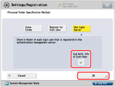You can use personal folders without specifying authentication information for each user when the conditions below are met. In that case, deselect [Use Auth. Info. of Each User].