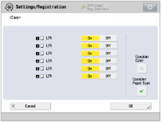 If you set to 'On', settings specified in "Specifying Paper Drawer Auto Selection Based on Colour" are applied. If you use different paper for colour copying and black copying, the specified paper sources are only eligible for use with Automatic Paper Selection and Auto Drawer Switching.