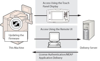 You can update the firmware of the machine to the most recent version using the "Register/Update Software." You can use this function from both the touch panel display and the computer (Remote UI).