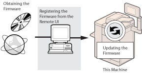 You can update the firmware of the machine to the most recent version using the "Register/Update Software" function from the Remote UI.