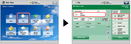 → [Fax] → specify the desired destinations → press the resolution button.