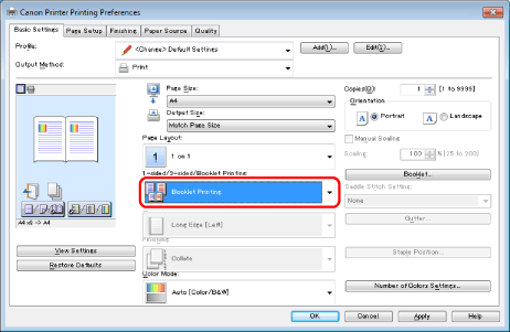Select [Booklet Printing] from [1-sided/2-sided/Booklet Printing].