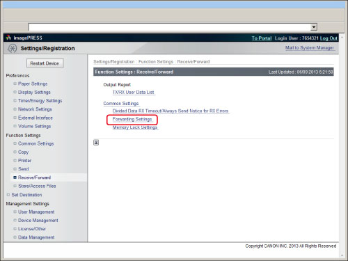You can also specify forwarding settings from the control panel of the machine by pressing [Function Settings] (Settings/Registration) → [Receive/Forward] → [Common Settings] → [Forwarding Settings]. For instructions on using the control panel to specify forwarding settings and more information on forwarding settings, see "Receive/Forward."