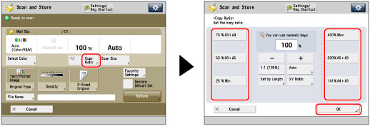 Press [Copy Ratio] → adjust the zoom ratio using [-] and [+] → press [OK].