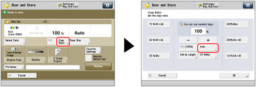 Select this mode to have the machine automatically select the zoom ratio based on the selected record size. The available zoom ratios are from 25% to 400% for the Mail Box function, and from 50% to 200% for the Memory Media function. The same zoom ratio is used for the horizontal and vertical axes.