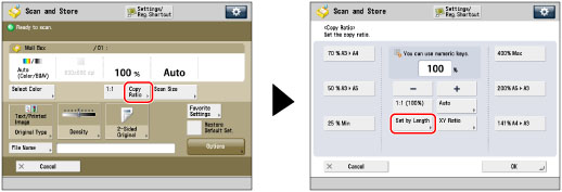 You can enlarge or reduce originals by any zoom ratio in 1% increments. The available zoom ratios are from 25% to 400% for the Mail Box function, and from 50% to 200% for the Memory Media function. The same zoom ratio is used for the horizontal and vertical axes.