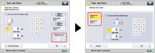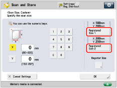Press [Register Size] → select [Registered Size 1] or [Registered Size 2].