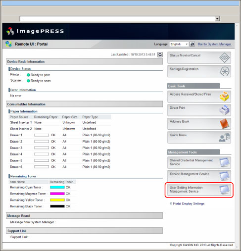 To specify each setting for User Setting Information Management Service, it is necessary to access and then log in to the machine from the Web browser. This section describes the procedure for accessing the machine from the portal page of the Remote UI.