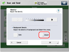 If you adjust the background density by pressing [Adjust] for <Background Density>, the [Auto] setting is cancelled. Similarly, if you press [Auto] while making manual adjustments in [Adjust], your adjustments are cancelled. The machine automatically adjusts the density to match the background.