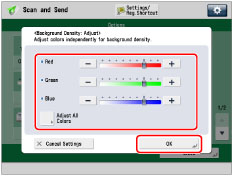 Press [Adjust Each Color] to adjust the density of red, green, and blue colour independently. Press [-] or [+] to adjust the density of each colour → press [OK].