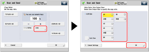 If you set PDF (Trace & Smooth), PDF (Compact), PDF (OCR), XPS (Compact), XPS (OCR), or OOXML as the file format, you can only send at a zoom ratio of [1:1 (100%)] or [Auto].