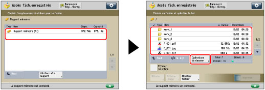 Sélectionner le support mémoire souhaité → sélectionner le niveau de dossier souhaité → appuyer sur [Opérations du dossier].
