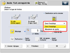 [Déf. nb copies à empiler] ne peut être défini que si [Zone d'empilage] est sélectionné sous <Destination sortie stacker>.