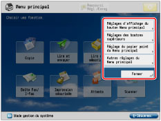 dans la partie supérieure droite de l'écran, l'écran suivant s'affiche. Sélectionner les réglages dans l'écran affiché et régler l'affichage de l'écran Menu principal.