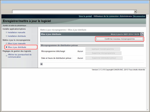 Il est possible de contrôler le nouveau microprogramme applicable sur la machine et de spécifier les réglages de distribution.