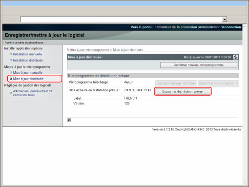 Appuyer sur [Mettre à jour le microprogramme] → [Supprimer la distrib. prévue].