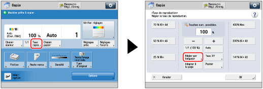 Ce mode permet d'agrandir ou de réduire les originaux en saisissant séparément les dimensions de l'original et de la copie. Le taux de reproduction peut être compris entre 25 et 400 %.