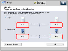 Pour copier nettement le texte ou les lignes, le réglage devrait être placé vers [Maxi] pour la zone Texte. Pour lire des originaux comportant des photos imprimées ou autres demi-teintes, le réglage devrait être placé vers [Mini] pour la zone Photo/Image.