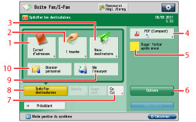 Appuyer sur [Vers Carn. adr distant] pour indiquer les destinataires mémorisés sous les boutons de composition 1 touche d'une machine serveur en accédant depuis une machine cliente sur le réseau. Pour plus d'informations, voir "Spécification d'un destinataire à l'aide des boutons de composition 1 touche d'une machine serveur".