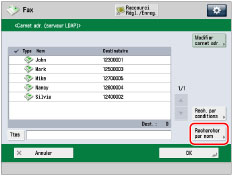 Le nombre de résultats de recherche affichés ne pourra pas dépasser la limite définie dans le paramètre [Mémoriser serveur LDAP]. Si le destinataire recherché n'est pas affiché, il est possible soit d'augmenter le nombre maximal d'adresses susceptibles d'être recherchées, soit de modifier le critère de recherche. (Voir "Mémorisation d'un serveur LDAP".)