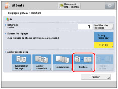 Les modes Piqûre à cheval et Division en brochures ne peuvent être réglés que si le Module de Finition P.A.C.-AM2/Module de Finition agrafage-T1 est installé.