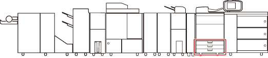 Faire glisser les guides jusqu'à ce qu'un déclic se fasse entendre. Si les guides gauche et avant ne sont pas alignés correctement, le format papier indiqué sur l'afficheur tactile sera erroné. Il est également nécessaire de régler correctement les guides afin d'éviter les bourrages papier, les impressions sales ou l'encrassement de l'intérieur de la machine.