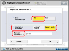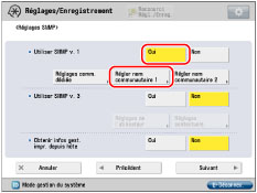 Appuyer sur [Oui] pour <Utiliser SNMPv1> → [Réglages comm. dédiée]. Appuyer sur [Oui] pour <Communauté dédiée> → [Lecture/Ecriture] pour <Autorisation accès MIB>.
