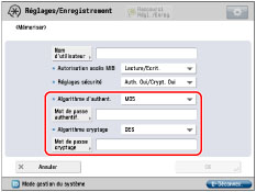 Sélectionner [MD5] ou [SHA1] dans la liste déroulante <Algorithme d'authent.> → définir [Mot de passe authentif.].