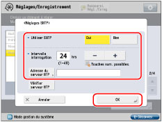 Appuyer sur [Réglages SNTP] pour [Réglages TCP/IP] → effectuer les réglages suivants → appuyer sur [OK].