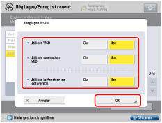 <Utiliser navigation WSD> est automatiquement défini sur "Oui" si [Oui] est sélectionné pour <Utiliser WSD>. Il est alors possible d'obtenir des informations concernant la machine via WSD.