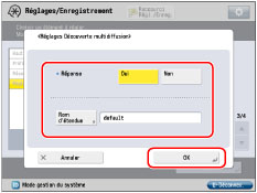 Appuyer sur [Réglages Découverte multidiffusion] pour [Réglages TCP/IP] → effectuer les réglages suivants → appuyer sur [OK].