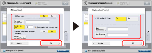 Pour utiliser la fonction d'authentification proxy, appuyer sur [Régler authentification] → appuyer sur [Oui] pour <Util. authentif. Proxy>. Appuyer sur [Nom d'utilisateur] → saisir le nom d'utilisateur à utiliser pour l'authentification proxy → appuyer sur [OK]. Appuyer sur [Mot de passe] → saisir le mot de passe à utiliser pour l'authentification proxy → appuyer sur [OK]. Dans l'écran de confirmation, entrer le même mot de passe pour le confirmer → appuyer sur [OK].