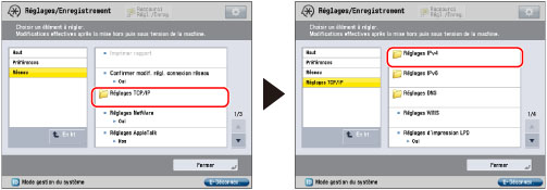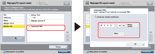 Si le temps de démarrage de la fonction réseau de la machine est défini en suivant la procédure de la section "Réglage du délai d'attente de la connexion au démarrage", n'exécuter la commande PING qu'une fois le délai défini dans [Délai de connexion au démarrage] écoulé.