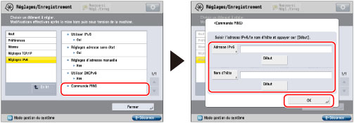 Appuyer sur [Commande PING] pour [Réglages IPv6] → effectuer les réglages suivants → appuyer sur [OK].